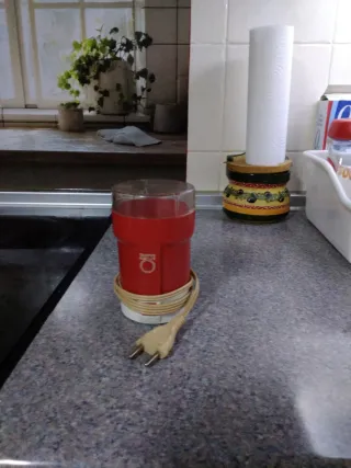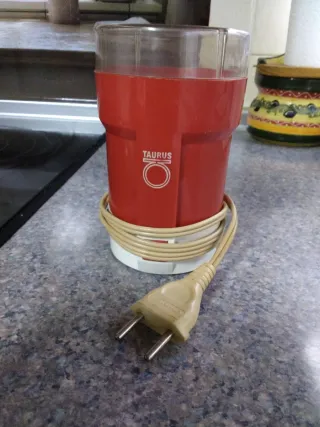 Molinillo de café Taurus de color rojo con tapa transparente. El cable se enrolla en la base. - Diseño compacto. - Marca: Taurus.