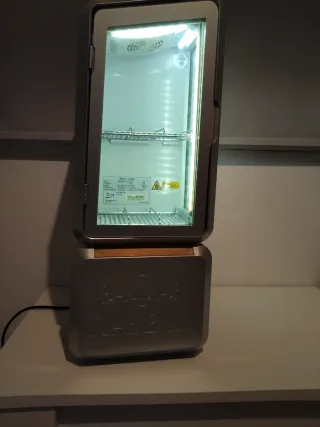 Nevera compacta de color plateado con detalles en madera. - Puerta con cristal. - Interior con estantes. - Diseño moderno.