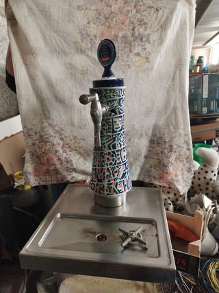 Dispensador de cerveza Estrella Galicia, en buen estado. Ideal para bares o uso particular. - Dispensador de cerveza de cerámica y acero inoxidable. - Incluye grifo y base. - Decoración con motivos geométricos. - Perfecto para coleccionistas. - La estructura de sargadelos tiene fisuras,habría que repararla o cambiarla.