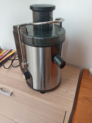Batidora pequeña, ideal para zumos y batidos. Incluye vaso y base. Está en buen estado, aunque algo usada. - Perfecta para preparar bebidas rápidamente. - Fácil de limpiar y guardar. - Diseño compacto y ligero.Entrega en mano en Barcelona