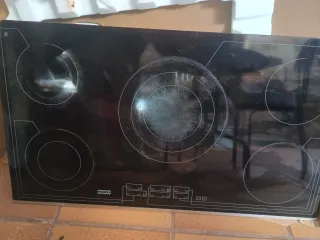 Placa vitrocerámica de la marca Teka con 90cm de ancho. Diseño moderno y elegante para tu cocina. - Superficie de cristal negro. - Cinco zonas de cocción. - Controles táctiles. - Indicador de calor residual. Tiene una esquina rota, pero funciona perfectamente