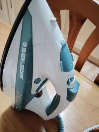 Plancha de vapor Black+Decker en color blanco y turquesa. - Potencia de 1750W. - Base de planchado. - Indicadores de función.