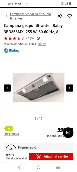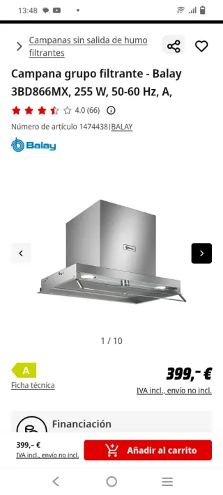 Campana de integración Balay prácticamente nueva. - Modelo: 3BD866MX - Potencia: 255 W - Frecuencia: 50-60 Hz - Eficiencia energética: A