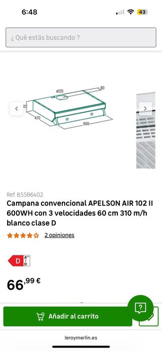 Campana extractora convencional de la marca Apelson. Vendo 2 camapanas, una completamente nueva sin uso y otra en muy buen estado como nueva, vendo las dos por 40€ cada una en 25€ - Modelo: AIR 102 II 600WH - Color: Blanco - Ancho: 60 cm - Velocidades: 3 - Caudal: 310 m/h - Eficiencia energética: Clase D