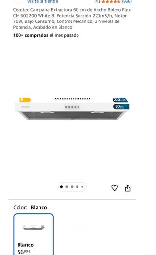Campana extractora Cecotec de 60 cm de ancho, modelo Bolero Flux CM 602200. - Acabado en blanco. - Potencia de succión de 220 m³/h. - Motor de 70W. - Bajo consumo. - Control mecánico con 3 niveles de potencia. - Defecto: tiene una abolladuras en un lado. No influye en su funcionamiento. - Precio online 56,60€
