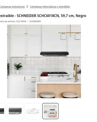 Campana extractora de la marca Schneider, con un ancho de 60cm. - Diseño moderno y funcional. - Acabado en color negro. - Ideal para cocinas. - Incluye manual de instrucciones.