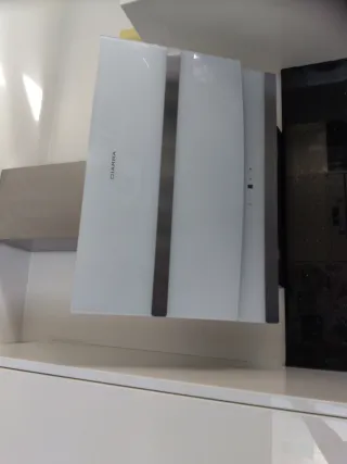 Campana extractora de cocina de la marca CIARRA con un ancho de 60 cm. Su diseño moderno combina cristal blanco y acero inoxidable. El nivel 1 apenas aspira, en 2 y 3 va muy bien. - Acabado en cristal blanco y acero. - Ancho de 60 cm.