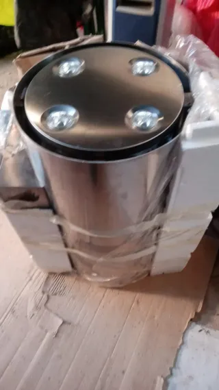 Campana extractora de cocina de acero inoxidable con luces integradas. - Acabado en acero inoxidable. - Cuatro luces LED en la parte superior. - Diseño cilíndrico moderno.