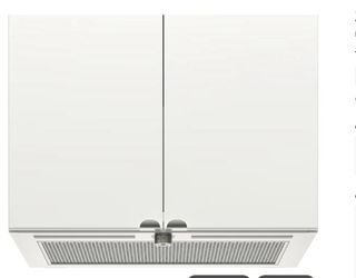 Campana extractora de diseño integrado para cocina. - Acabado en blanco. - Panel frontal de acero inoxidable con rejilla. - Controles integrados en la parte frontal.