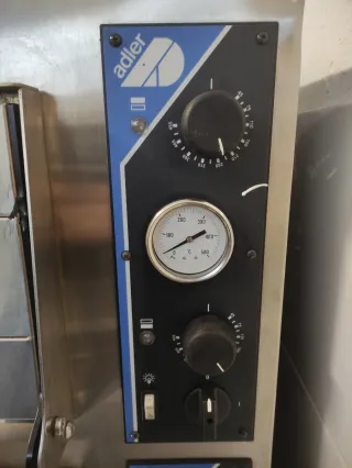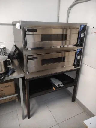 Horno de pizzas Adler de acero inoxidable, ideal para negocios. - Doble cámara de cocción. - Puertas con ventana. - Mandos de control. - Estructura metálica. Se vende con soporte/mesa con balda
