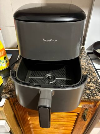 Freidora de aire Moulinex en color gris y negro. Cuenta con un diseño moderno y compacto. - Cesta extraíble. - Panel de control superior.