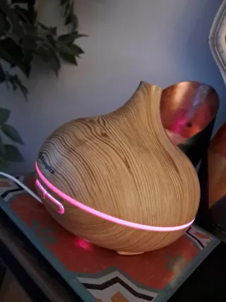 Este ambientador y purificador de aire tiene un diseño inspirado en la madera, con una luz LED que cambia de color. - Diseño con acabado de madera. - Luz LED ambiental.