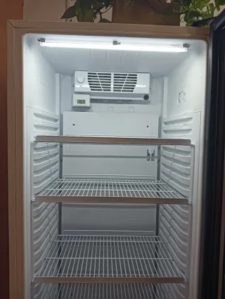 Nevera de color blanco, ideal para mantener tus alimentos frescos. Cuenta con estantes de rejilla y un diseño interior funcional. - Iluminación LED interior. - Panel de control con termostato. - Estantes ajustables. Con garantía