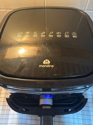 Freidora de aire de la marca Mandine en color negro, es la marca de Carrefour. Tiene 2 años de antigüedad. Cuenta con pantalla digital, diferentes modos de cocinar y control por ruleta (temperatura hasta 200 grados y tiempo hasta 60 minutos). Tiene una capacidad de 7 litros o algo más, la cesta hace medidas de 22,5cm de ancho y de fondo, de altura son 11,5cm. Usada poco y con mucho cuidado. Es muy cómoda. Siempre se ha limpiado después de cada uso. - Diseño moderno y compacto. - Panel de control intuitivo. - Asa ergonómica para extraer la cesta. **El tiempo/temperatura se ven bien en pantalla pero la foto no captura bien la luz.