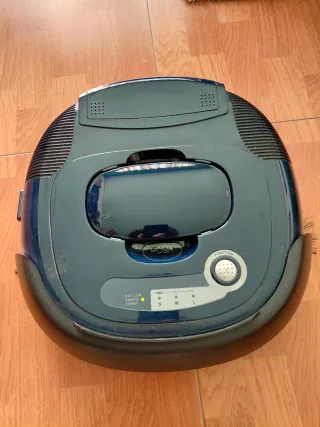 Robot aspirador de color azul oscuro, con un diseño circular y compacto. Cuenta con un asa superior para facilitar su transporte y un panel de control en la parte superior. - Indicador de batería baja/carga/encendido. - Botón de función. - Indicadores de tiempo S, M, L. Falta batería no dura y cargador por eso este precio