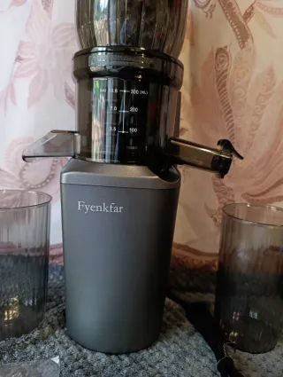 Exprimidor de la marca Fyenkfar, en color gris oscuro. Incluye dos vasos. Nuevo a estrenar - Diseño moderno. - Dos vasos incluidos.