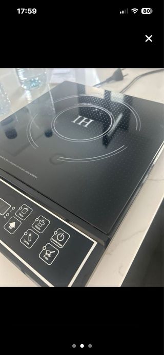 Placa de inducción portátil con diseño moderno y elegante. - Superficie lisa de cristal negro. - Panel de control digital con iconos. - Indicador de calor residual.