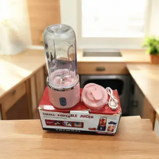 Exprimidor portátil de color rosa, ideal para preparar tus batidos y zumos. - Diseño compacto y fácil de transportar. - Incluye tapa y cable de carga USB.