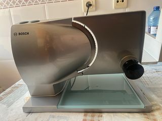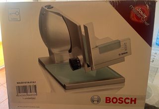 Cortafiambres de la marca Bosch, modelo Junior MasterChef. Ideal para el hogar. - Diseño compacto y moderno. - Cuchilla de acero inoxidable. - Ajuste de grosor de corte. - Base de cristal. - Incluye manual de seguridad.