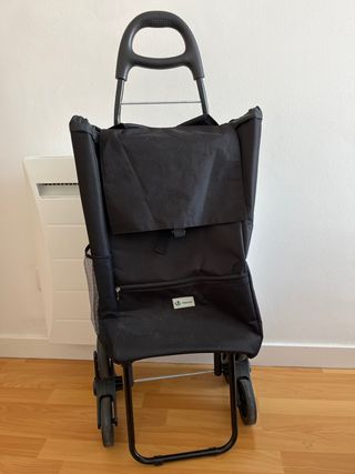 Carro de la compra en color negro. - Estructura metálica. - Bolsa de tela en el interior forrada para congelados o comida caliente. - Ruedas para facilitar el transporte y subir escaleras. - La bolsa es extraíble para usar como mochila o cargar en las escaleras. Se vende porque no se usa.