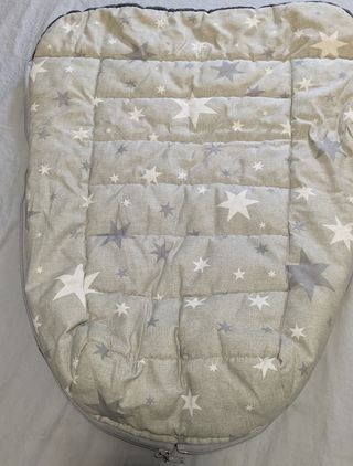 Saco de invierno para carro o silla de bebé de 0 a 9 meses. Dispone de aperturas para pasar arnés y que el bebé vaya sujeto. Tejido muy blandito y caliente. El reductor de la cabeza se puede retirar.