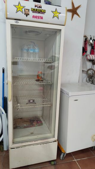 Frigorífico expositor vertical en buen estado. Ideal para negocio o uso doméstico. - Marca: Desconocida - Modelo: Fiesta - Medidas aproximadas: 1.70m (alto) x 0.60m (ancho) x 0.60m (fondo) - Tiene tres estantes de rejilla.