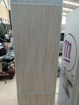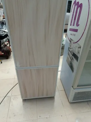 Refrigerador comercial con diseño moderno y elegante. - Acabado en madera clara veteada. - Dos secciones de almacenamiento. - Marco exterior blanco.