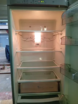 Nevera combi de acero inoxidable,mide 2m de alto x 60cm de ancho con congelador en la parte inferior y refrigerador en la superior. Dispone de varios estantes y cajones para organizar tus alimentos. - Puertas reversibles. - Iluminación interior LED. - Cajón para frutas y verduras.
