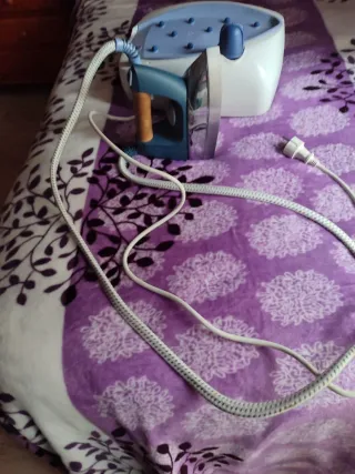 Sistema de planchado a vapor con plancha ergonómica. - Base de color blanco y azul. - Plancha con mango de madera. - Manguera de vapor flexible. Hace mucho qué no lo uso.