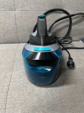 Centro de planchado Cecotec en perfecto estado, sin usar. - Diseño moderno en negro y turquesa. - Base con asa ergonómica. - Manguera de vapor negra.