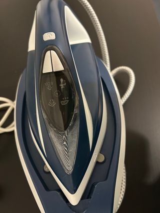 Centro de planchado con base y plancha. - Diseño moderno en blanco, negro y azul. - Asa ergonómica con detalles en corcho. - Indicadores luminosos en la plancha. - Base con símbolos informativos.