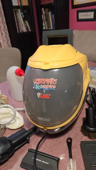 Vendo Vaporella Polti 505 Pro en buen estado de funcionamiento. Ha sido siempre muy cuidada y se entrega limpia. Presenta algunos detalles estéticos y de uso que no afectan al manejo básico: Le falta el embellecedor del tapón del depósito, aunque el depósito se abre y cierra sin problema. Al encenderla, parte del vapor sale de forma continua, por lo que no es ideal para trabajos que requieran mucho vapor. Aun así, el aparato sigue funcionando correctamente para usos más ligeros. Perfecta para quien busque una vaporetta funcional a buen precio o para quien quiera repararla y dejarla como nueva.