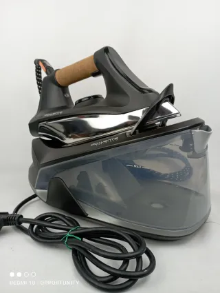 Centro de planchado Rowenta en color negro y gris. - Base de plancha con mango de madera. - Depósito de agua transparente. - Manguera de vapor. Con recoge cables, y caja original. Comprada en junio 2025, aún con garantía hasta 3 años.