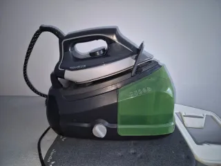 Perfect Steam Pro de Rowenta, Centro de planchado, 1,1L, 6,9 bares, Golpe de 450 g/min, Verde - Depósito de agua extraible, se puede rellenar de agua con la plancha encendida. - Asa de transporte en la plancha, con un clip de seguridad. La plancha funciona, solo que cuando sale vapor en las primeras pulsaciones sale marrón. Luego ya normal. De ahi el precio. Por lo demas está perfecta.