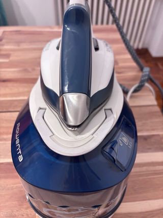 Centro de planchado Rowenta Turbosteam en color negro y azul. - Base de plancha con suela de acero inoxidable. - Depósito de agua extraíble de 1.7L. - Potencia de 2200W. - Función de vapor vertical. Solo utilizado para probarlo
