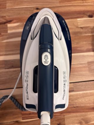 Centro de planchado Rowenta en color azul y blanco. Diseñado para un fácil almacenamiento y uso. - Depósito de agua integrado. - Suela de alto deslizamiento. - Sistema anti-cal.