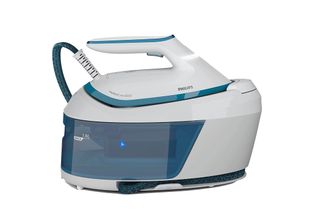 Centro de planchado Philips con una potencia de 2400W. Su diseño combina blanco y azul. - Depósito de agua de 1.8L. - Manguera de vapor.