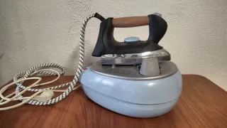Centro de planchado de la marca FAR, imagino que se fabricó tres años antes de que existiese la humedad, al ser sovietico sigue funcionando que da gusto. La vendo porque en mi casa no se plancha. - Base de plancha metálica. - Mango de madera. - Depósito de agua de color azul claro.