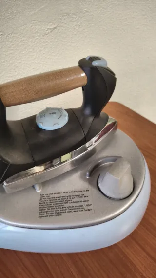 Plancha de ropa con base metálica y mango ergonómico de corcho. - Base de plancha cromada. - Mango con recubrimiento de corcho. - Dial de control de temperatura. - Cable de alimentación grueso. Solo la plancha para conectarla a un centro Dy4. No ha sido utilizada.