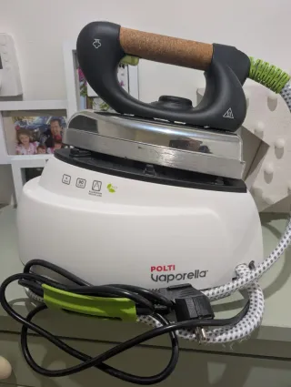 Centro de planchado Polti Vaporella con base blanca y plancha metálica. La cambio por una más potente por gran cantidad de plancha semanal -1750W. - Mango ergonómico con detalle de corcho. - Manguera de vapor con funda textil. - Cable de alimentación enrollado con clip de sujeción.