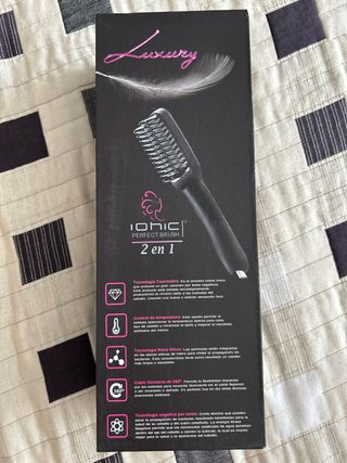 Comprado en enero de 2024. NO HA SIDO USADO NUNCA. Cepillo alisador pelo que calienta y alisa, temperatura ajustable 160 ° - 180 ° - 200 °, tecnología Thermo-control y tecnología iónica. Las dimensiones del cepillo son de 28,4 x 7,4 x 4 cm.