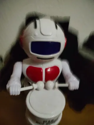 Divertido robot que toca la batería. - Con sonido y luces. - Diseño blanco y rojo. - Pantalla azul en el visor. - Incluye baquetas