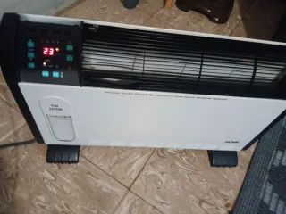 Calentador eléctrico TRONIC con sistema de ventilador. - Panel de control digital con pantalla. - Patas de apoyo incluidas. - Diseño blanco y negro.
