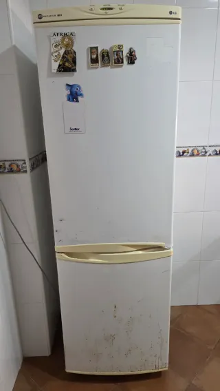 Nevera de la marca LG en color blanco. Dispone de dos puertas, una superior para el frigorífico y otra inferior para el congelador. El estado de la nevera por la parte exterior es tal y como se muestra en las fotografías. Por dentro está en muy buen estado. Su funcionamiento es excelente, tanto frigorífico como congelador.