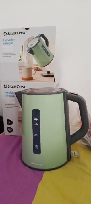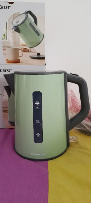 Hervidor de agua eléctrico de la marca SilverCrest en un llamativo color verde. - Capacidad máxima de 1.7L. - Indicador de nivel de agua. - Base giratoria de 360°.