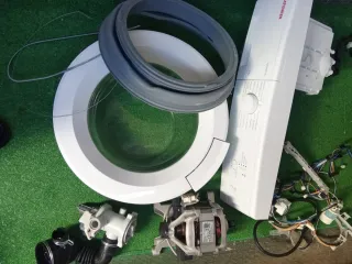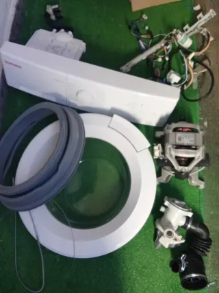 Conjunto de piezas de lavadora. - Motor eléctrico. - Bomba de desagüe. - Goma de escotilla. - Panel de control. - Puerta de cristal.