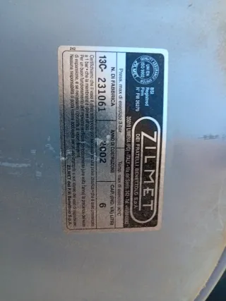 Vaso de expansión ZILMET, modelo 13C-231061, fabricado en 2002. - Presión máxima de ejercicio: 3 bar. - Temperatura máxima de ejercicio: 90°C. - Capacidad: 6 Litros. - Certificado y pre-cargado a 1 bar. - Fabricante: ZILMET dei Fratelli Benettolo S.P.A.