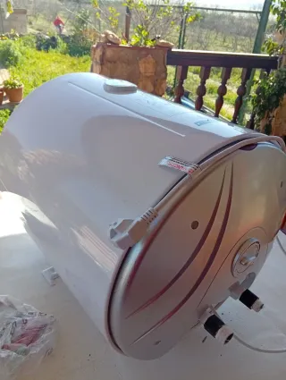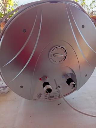Termo eléctrico de diseño moderno y compacto. - Acabado plateado con detalles curvos. - Control de temperatura con selector giratorio (LOW, ECO, HIGH). - Conexiones de agua fría y caliente visibles. - Indicador de presión máxima: 0.85MPa. - Potencia: 1500W. - Protección IPX4.