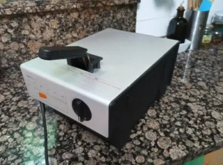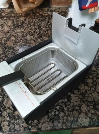 Freidora Solac, de gran capacidad, 3'5 litros de aceite aprox. Ideal para freir bastante cantidad de comida en poco tiempo. Interior hecho en acero inoxidable. Muy fácil de desmontar para poder limpiarla comodamente. Fabricada en España. Panel de control sencillo y algo borrado por el uso aunque funciona perfectamente.