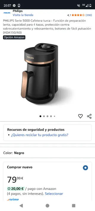 Cafetera turca Philips Serie 5000 en color negro. Diseñada para preparar café de forma lenta y con capacidad para 4 tazas. Se encuentra en perfectas condiciones, en su caja, con sus accesorios y su manual de instrucciones. Hago envíos y devoluciones.Posibilidad de recoger en Churriana o Albolote. Más artículos parecidos en mi perfil. - Protección contra sobrecalentamiento y rebosamiento. - Botones de fácil pulsación. - Modelo: HDA150/60.